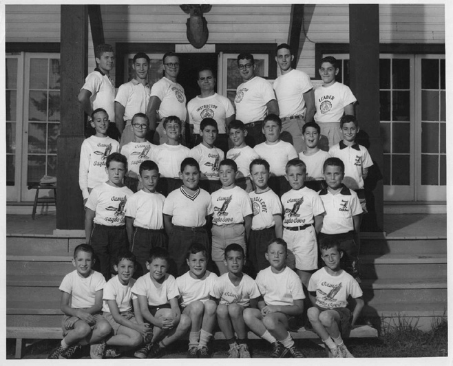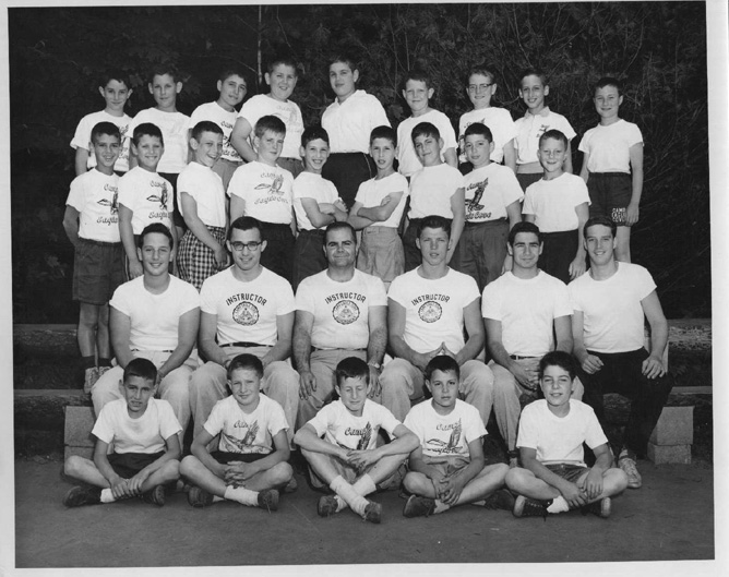 Top row, first on left= Mike Lippman, next, Warren Rosenbaum,. To right of Leonard Gerber is Jon Lovitt, then Mark Smith. Second row- Joey Paul is the second camper on the left, 5th from left is Andy Germanow, then Wendell(Wendy) Kane, Marty Becker and Leonard Gerber. Bottom row LtoRT- Artie Greenside, Stuie Kay, ? Howie Sosne, and Bob Wolfson. CIT on second row far rt. is Bob Natapow
